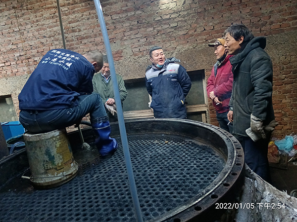 2022年1月24日星期一,虎年(農(nóng)歷臘月二十二)大寒季節(jié),室外時溫零下—16℃,遼寧省彰武縣興隆山鄉(xiāng)老虎坨子村,阜新市彰武縣達凱化工有限公司糠醛廠,在高經(jīng)理的精心安排下,蘇振山廠長給我們指導(dǎo),積極與我們河南都市機械設(shè)備有限公司喬俊陽技術(shù)員配合,改制了一款寬槽橡膠滑輪,對結(jié)垢堅硬,徹底燒干堵死的廢水蒸發(fā)器管子進行疏通,清理,經(jīng)過實驗,既節(jié)省了人力,又安全,又快捷,確實是值得分享的好辦法!